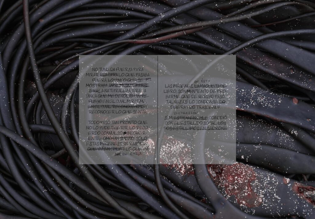 “Sal sobre la Herida” proyecto fotolibro, es un diario de mi experiencia personal y por ello subjetiva sobre los 11 meses que viví en Chile. Por fuera Chile estallaba, por dentro yo pasaba por algo muy parecido.